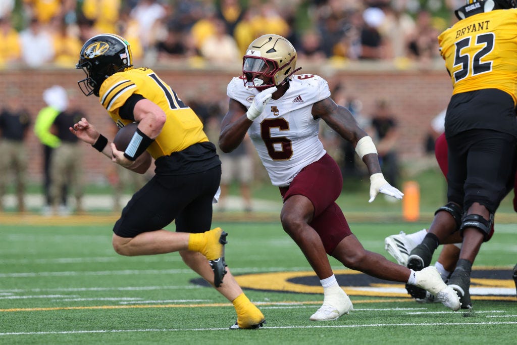 Shifting from playing off the ball to lining up on the edge this season, Carter quickly blossomed into the premier pass rusher in this draft, racking up 12.0 sacks, 24 tackles for a loss, and more than 60 pressures in 2024. His frame, athleticism, and lightning-quick first step compare favorably to Will Anderson Jr., the No. 3 pick in the 2023 draft.