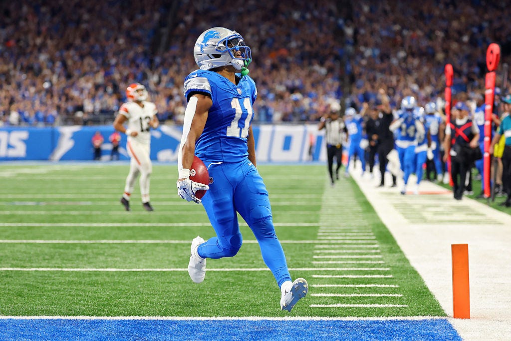 ● 3:00 — Taking over deep in the red zone after an interception, the Lions needed three snaps to extend their lead to two scores. On third-and-goal from the 2-yard line, St. Brown came open out of play-action for an easy score. LIONS 17, BROWNS 7