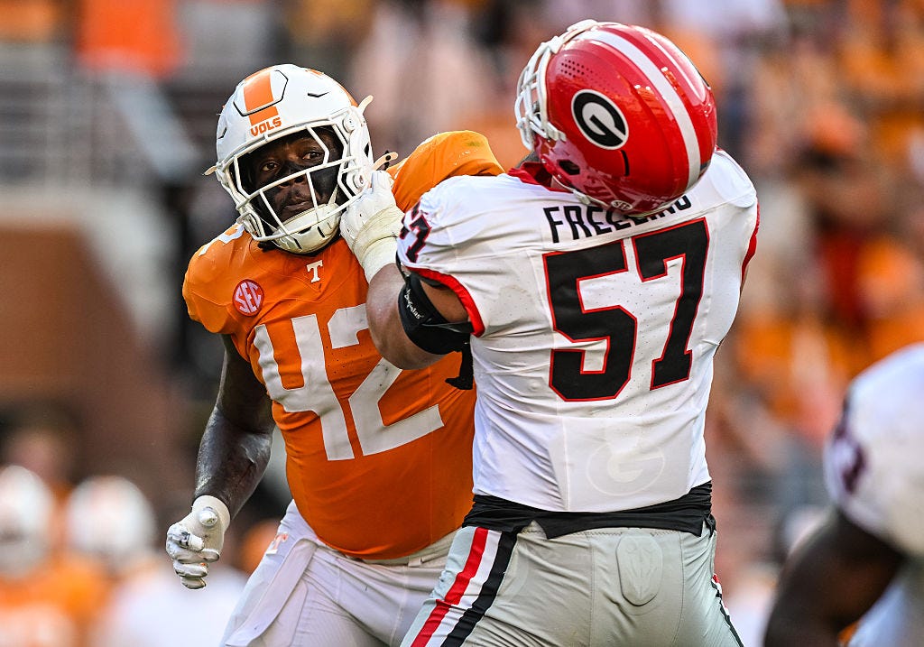 A wide-framed, heavy-handed rotational edge defender for the Volunteers, the 6-foot-2, 283-pounder tallied 7.5 tackles for a loss and a career-best 4.0 sacks last season.