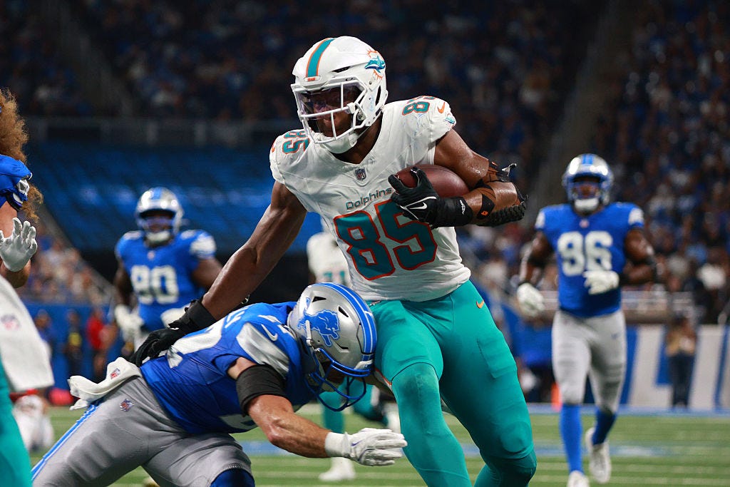 ● 1:18 — A big series for Western Michigan alum Dee Eskridge, who converted a third-and-12 with a 27-yard gain on a receiver screen to beat Detroit’s blitz, followed by a 12-yard catch-and-run score on a shallow cross two plays later, snagging a ball behind him and plowing through Ya-Sin at the goal line. DOLPHINS 7, LIONS 0