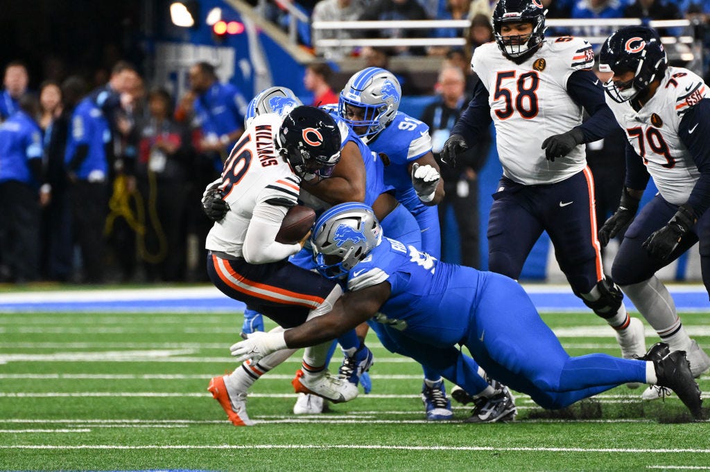 ● 3:11 — Detroit got a drive-opening run of 28 yards out of Jahmyr Gibbs, but little more before taking a 48-yard Bates kick to extend their first-half advantage. LIONS 16, BEARS 0