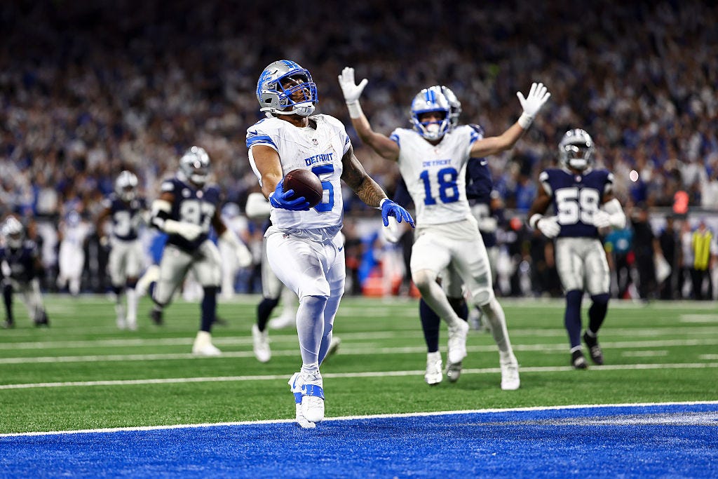 Dallas got it back within a score thanks to a short Aubrey field goal with 3:42 remaining, but Detroit counterpunched again with a quality kickoff return by Tom Kennedy followed by a 37-yard catch-and-run by Amon-Ra St. Brown into the red zone. One snap later, Gibbs was back into the end zone, this time from 13 yards out, putting the game on ice.