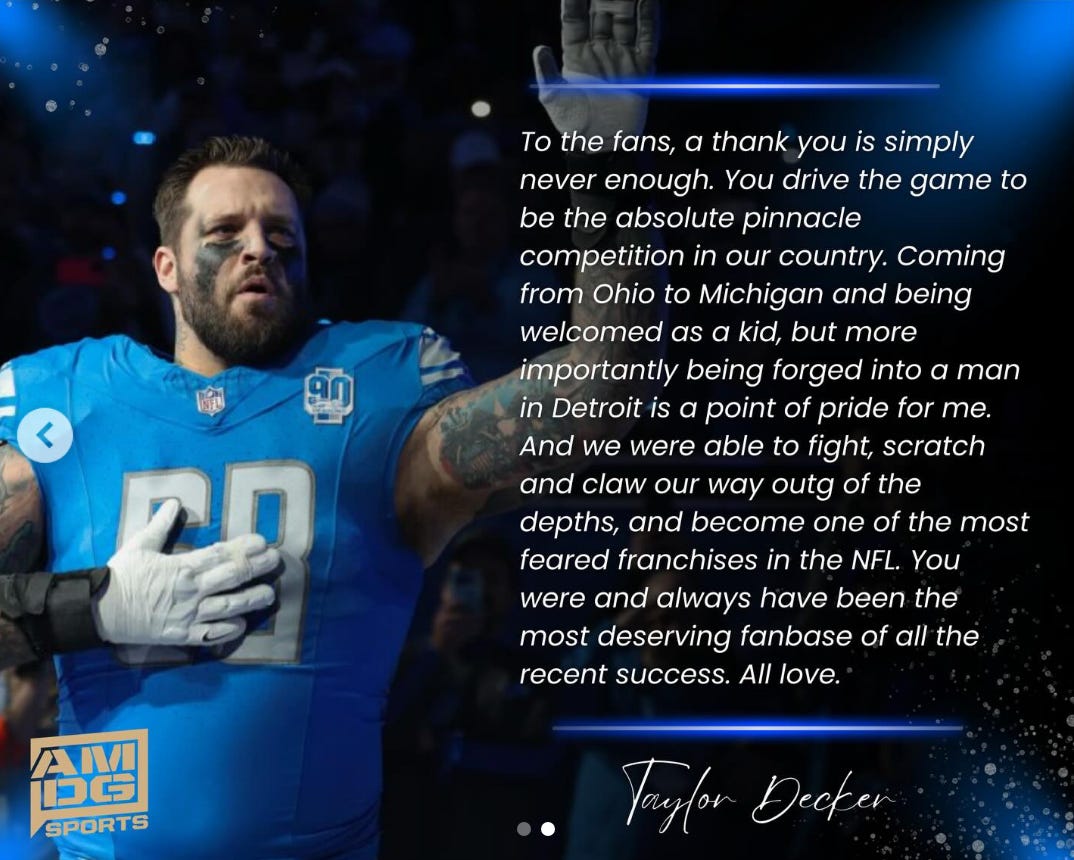 “To the fans, a thank you is simply never enough,” Decker wrote. “You drive the game to be the absolute pinnacle (of) competition in our country. Coming from Ohio to Michigan, and being welcomed as a kid, but more importantly being forged as a man in Detroit is a point of pride for me. And we were able to fight, scratch and claw our way outg (sic) of the depths, and become one of the most feared franchises in the NFL. You were and always have been the most deserving fanbase of all the recent success. All love.”