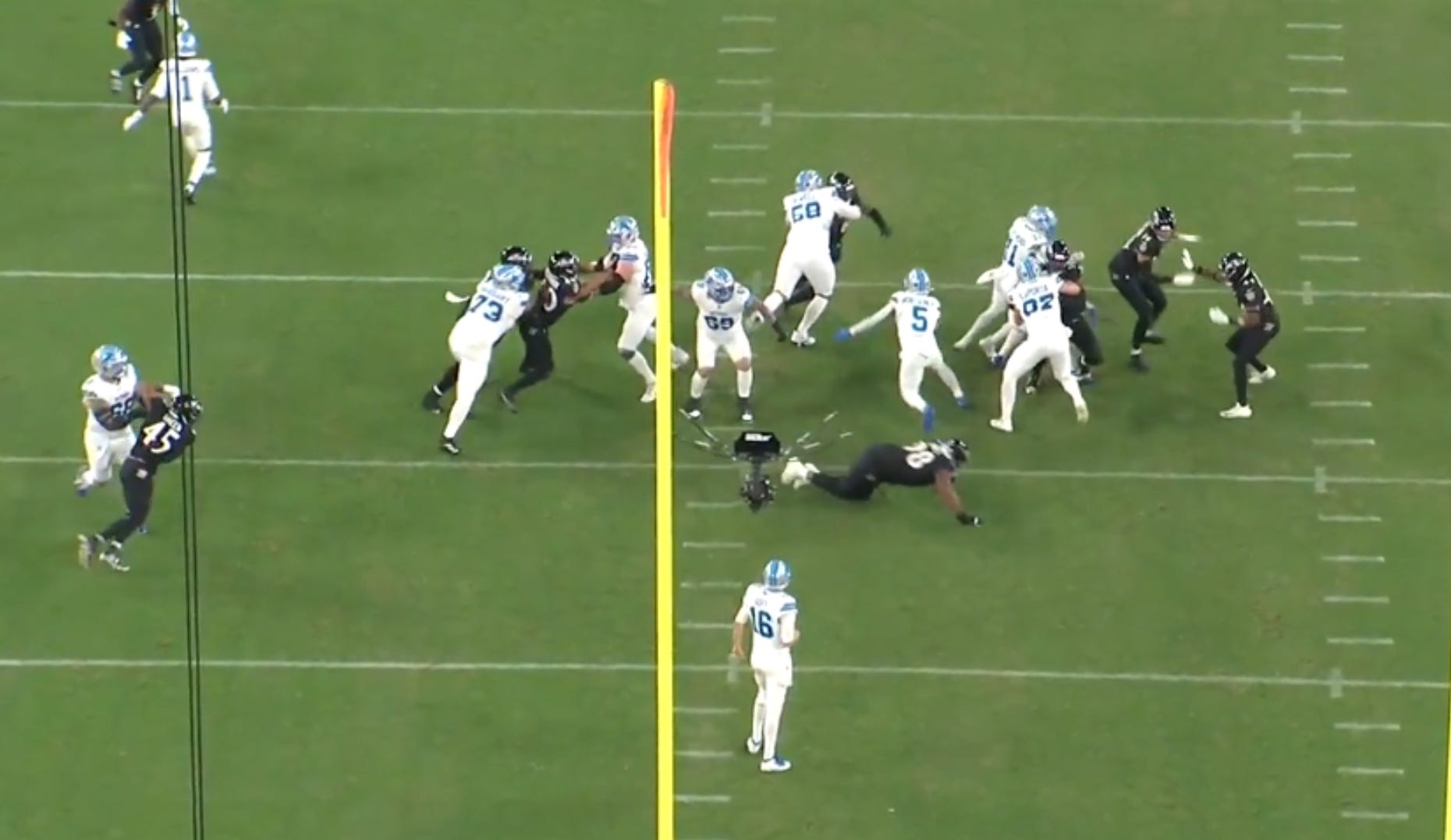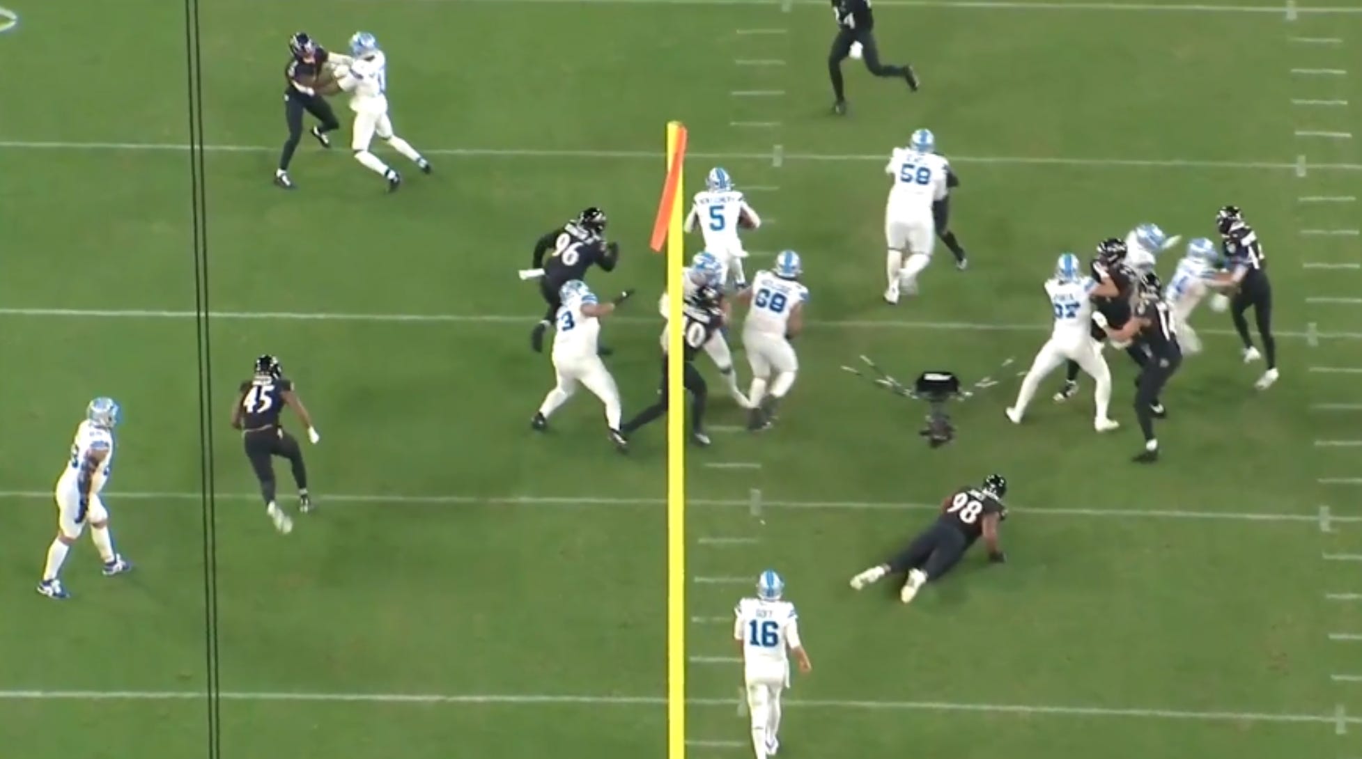 About the only downside from the snap is that Montgomery didn’t reach the end zone, getting caught from behind by Buchanan and Awuzie. The back’s top gear is decent, but doesn’t can’t match teammate Jahmyr Gibbs.