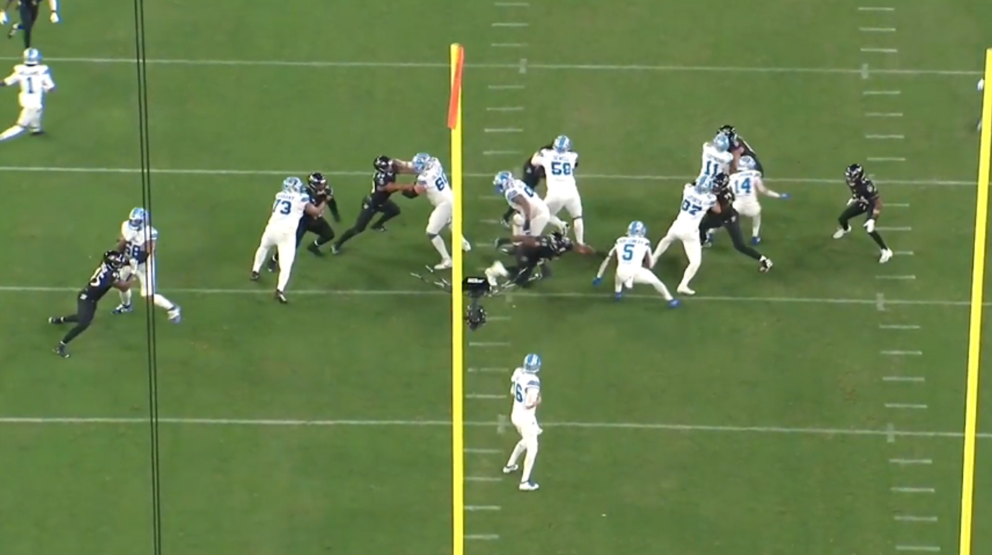 Not inconsequential to the play’s result, left tackle Taylor Decker and left guard Christian Mahogany won at the snap, eliminating two backside pursuers.