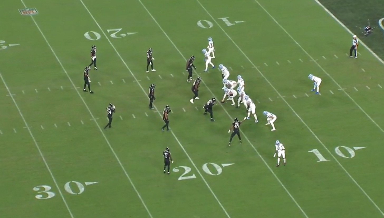 The Ravens countered with a six-man box, an under front, and a two-safety shell, but tight to the line of scrimmage, with both deep defenders just inside 10 yards depth. No one followed LaPorta’s motion across the formation, with only a slight shift inside by rookie outside linebacker Teddye Buchanan (40) in response.